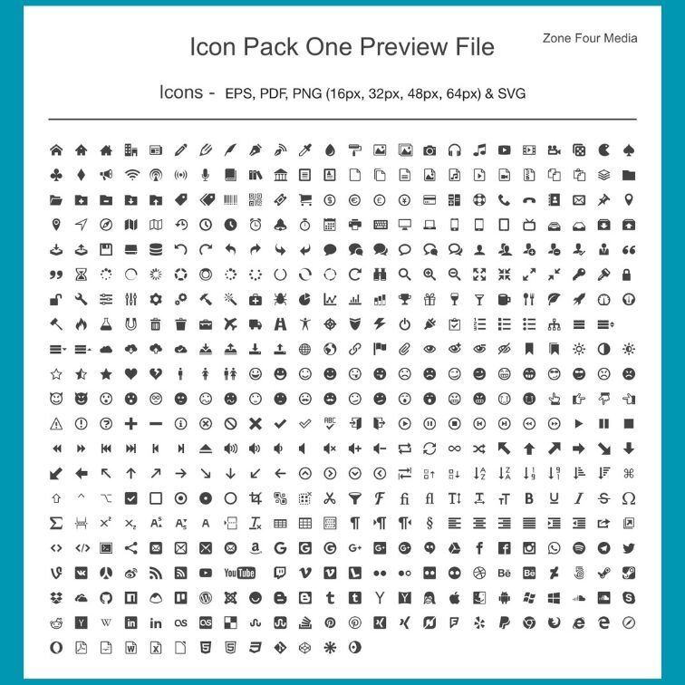 Icon Pack One - includes 491 icons in each of the following file formats: EPS, PDF, PNG (16px, 32px, 48px, 64px) & SVG